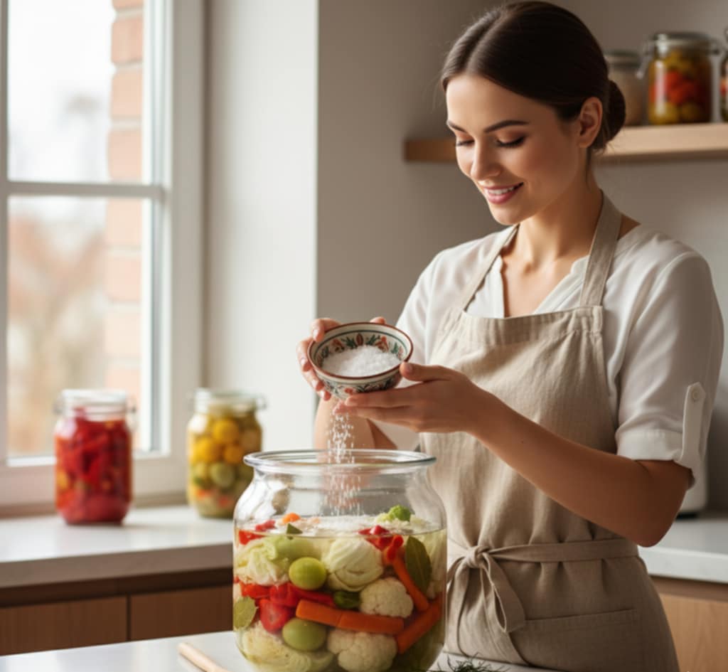 • Съвет: винаги използвайте каменна или морска сол. Йодираната сол може да забави ферментацията или да промени цвета на зеленчуците.
