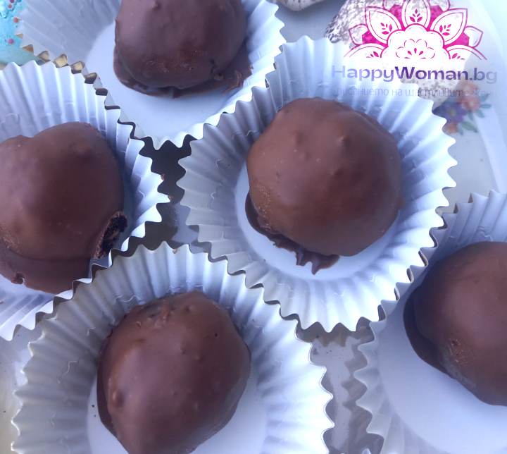 Сега пригответе глазурата, за да покриете бонбоните. Нарежете шоколада и добавете растителното масло. Поставете сместа в микровълнова фурна за 30-40 секунди. След това трябва да разбъркате добре готовата глазура, така че да стане хомогенна. Последният етап е да потопите бонбоните в шоколадовата маса и да ги задържите за известно време над чинията, така че излишната глазура да изтече. Поставете готовите бонбони върху специална решетка или пергамент, така че да се втвърдят. Сложете готовите домашни бонбони за 20-30 минути в хладилника и след това можете да ги опитате.