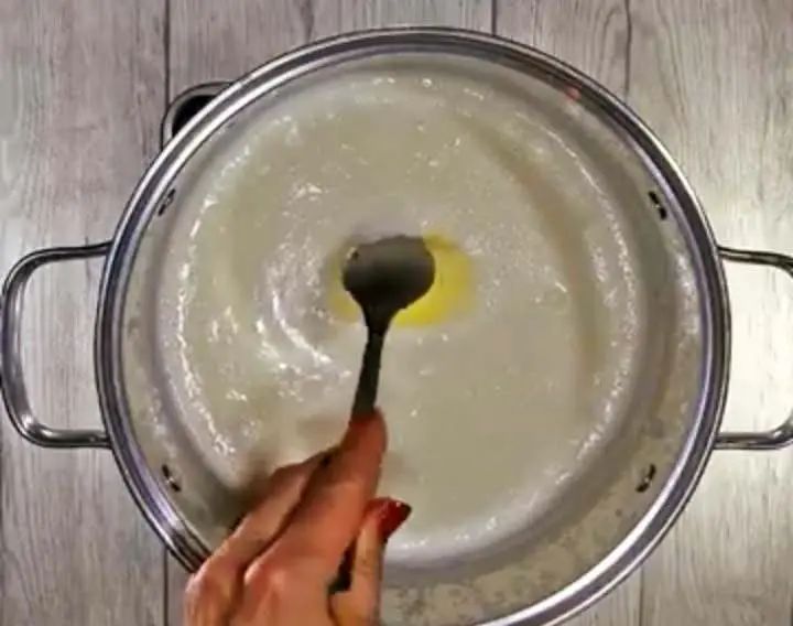 Разбъркайте добре и нагрейте, докато сместа започне да кипва. Намалете огъня след кипването. В купа разбъркайте брашното с малко студена вода, докато се получи смес, подобна на консистенцията на гладка каша без бучки. Постепенно добавяйте тази смес към млякото на бавен огън, като продължавате да разбърквате.